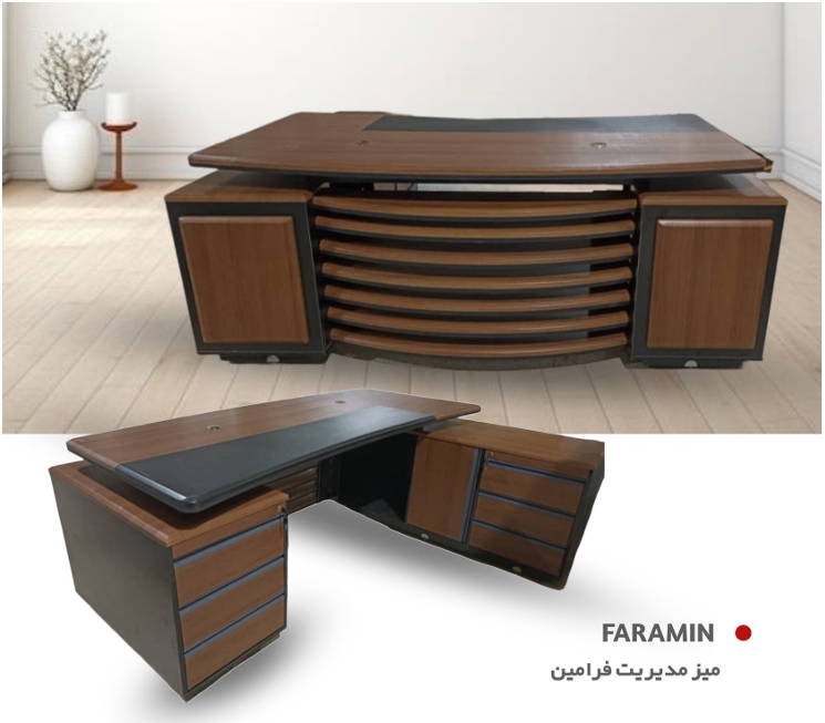 میز مدیریت فرامین با طراحی خاص و ترکیب متریال مدرن، جلوهای از شکوه و اصالت را در فضای کاری ایجاد میکند. فرم هندسی منظم، جزئیات دقیق و رنگبندی خنثی این میز باعث میشود با انواع دکوراسیونهای اداری همخوانی کامل داشته باشد. این مدل با هدف ایجاد فضای کاری لوکس و کاربردی برای مدیران طراحی شده است.