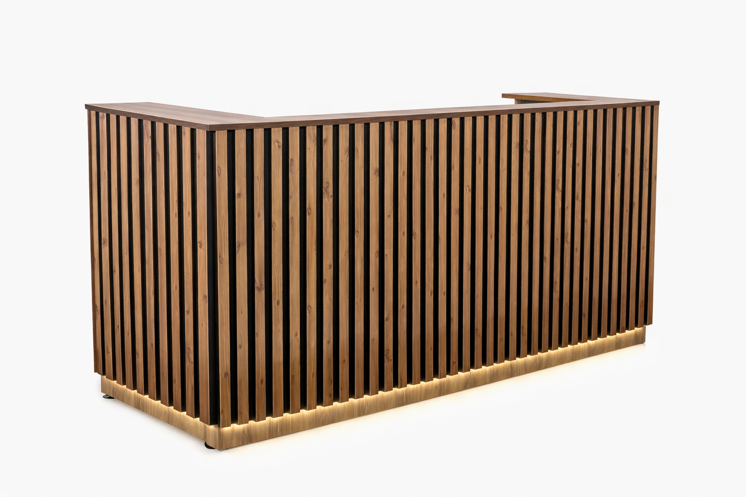 میز پذیرش مدرن چوبی با طراحی اسلت عمودی و نور مخفی