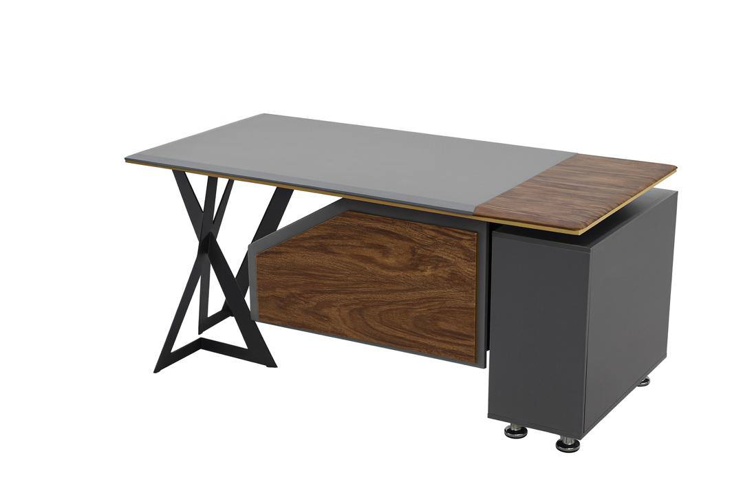 یک انتخاب شیک و حرفهای برای دفاتریه که میخوان فضای کاریشون هم جذاب باشه هم کاربردی. ترکیب صفحه طوسی مات با بخش چوبی طرح گردو، ظاهری مدرن و لوکس ایجاد کرده که فوری جلب توجه میکنه. پایههای فلزی با طراحی کراس، هم استحکام بالا میده و هم شخصیت دکور رو قویتر میکنه.